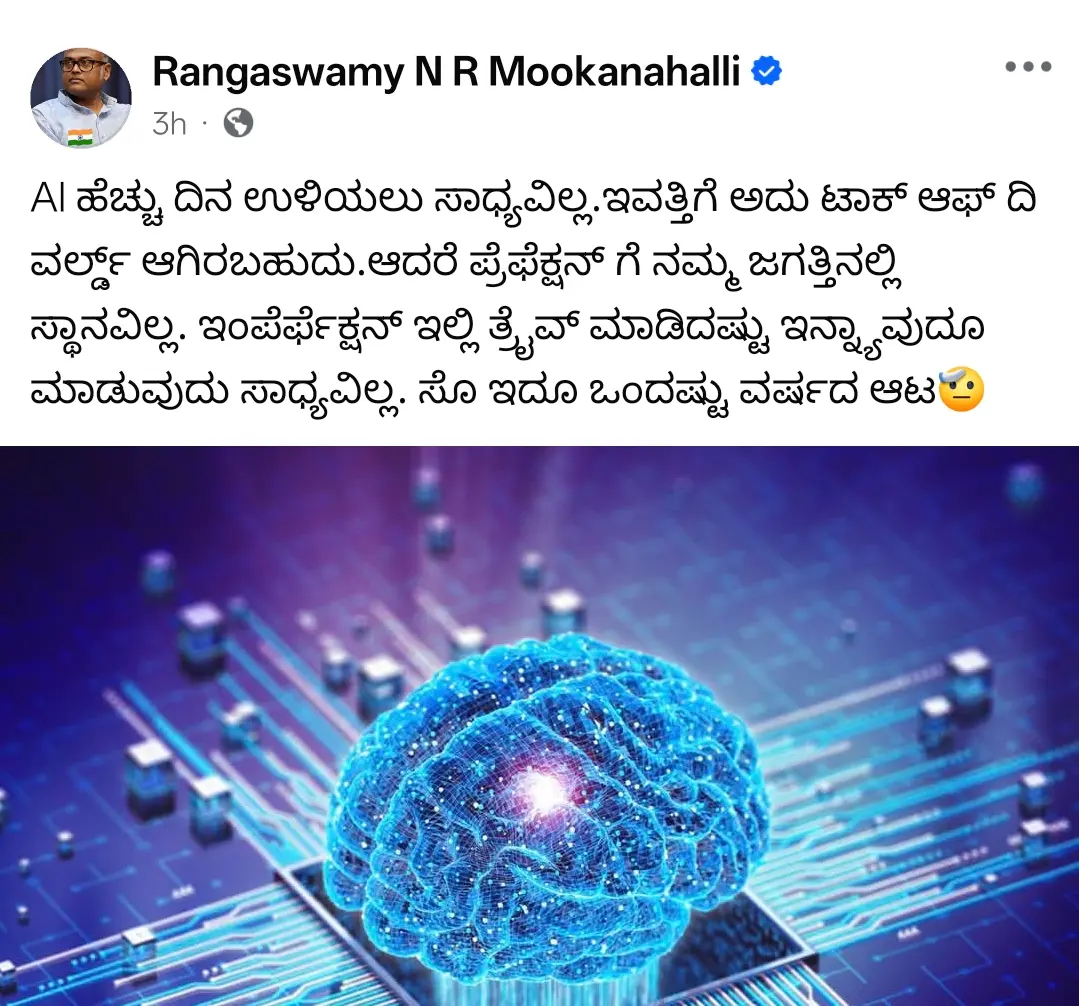 ಹಿರಿಯ ಲೇಖಕ ರಂಗಸ್ವಾಮಿ ಮೂಕನಹಳ್ಳಿಯವರು ಇವತ್ತು ಫೇಸ್ಬುಕ್ಕಿನಲ್ಲಿ ಬರೆದಿದ್ದರು, AI ಹೆಚ್ಚು ದಿನ ಉಳಿಯಲು ಸಾಧ್ಯವಿಲ್ಲ. ಇವತ್ತಿಗೆ ಅದು ಟಾಕ್ ಆಫ್ ದಿ ವರ್ಲ್ಡ್ ಆಗಿರಬಹುದು. ಆದರೆ ಪ್ರೆಫೆಕ್ಷನ್ ಗೆ ನಮ್ಮ ಜಗತ್ತಿನಲ್ಲಿ ಸ್ಥಾನವಿಲ್ಲ. ಇಂಪೆರ್ಫೆಕ್ಷನ್ ಇಲ್ಲಿ ತ್ರೈವ್ ಮಾಡಿದಷ್ಟು ಇನ್ನ್ಯಾವುದೂ ಮಾಡುವುದು ಸಾಧ್ಯವಿಲ್ಲ. ಸೊ ಇದೂ ಒಂದಷ್ಟು ವರ್ಷದ ಆಟ.