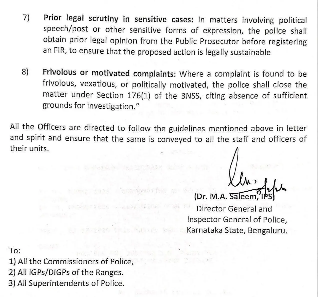 ಕರ್ನಾಟಕ ರಾಜ್ಯ ಪೊಲೀಸ್ ಇಲಾಖೆಯು ಇತ್ತೀಚಿನ ದಿನಗಳಲ್ಲಿ ಸಾಮಾಜಿಕ ಜಾಲತಾಣಗಳಲ್ಲಿನ ಪೋಸ್ಟ್ ಗಳ ಮೇಲೆ ನಡೆಯುತ್ತಿದ್ದ ಅನಗತ್ಯ ಎಫ್ಐಆರ್ ಹಾವಳಿಗೆ ಬ್ರೇಕ್ ಹಾಕಲು ನಿರ್ಧರಿಸಿದೆ. ಪೊಲೀಸ್ ಮಹಾನಿರ್ದೇಶಕ ಮತ್ತು ಐಜಿಪಿ ಡಾ. ಎಂ.ಎ. ಸಲೀಂ ಅವರು ಹೊರಡಿಸಿರುವ ನೂತನ ಮಾರ್ಗಸೂಚಿಗಳು ನಾಗರಿಕರ ಅಭಿವ್ಯಕ್ತಿ ಸ್ವಾತಂತ್ರ್ಯವನ್ನು ರಕ್ಷಿಸುವ ನಿಟ್ಟಿನಲ್ಲಿ ಒಂದು ಪ್ರಮುಖ ಮೈಲಿಗಲ್ಲಾಗಿವೆ. ಈ ಹಿಂದೆ ಯಾವುದೋ ರಾಜಕೀಯ ಒತ್ತಡಕ್ಕೆ ಮಣಿದು ಅಥವಾ ಸಣ್ಣ ಕಾರಣಗಳಿಗಾಗಿ ಯಾಂತ್ರಿಕವಾಗಿ ಪ್ರಕರಣಗಳನ್ನು ದಾಖಲಿಸಲಾಗುತ್ತಿತ್ತು. ಆದರೆ ಈಗ ಪೊಲೀಸರು ಯಾವುದೇ ದೂರು ಬಂದ ತಕ್ಷಣ ಆತುರದ ಕ್ರಮ ಕೈಗೊಳ್ಳುವಂತಿಲ್ಲ.