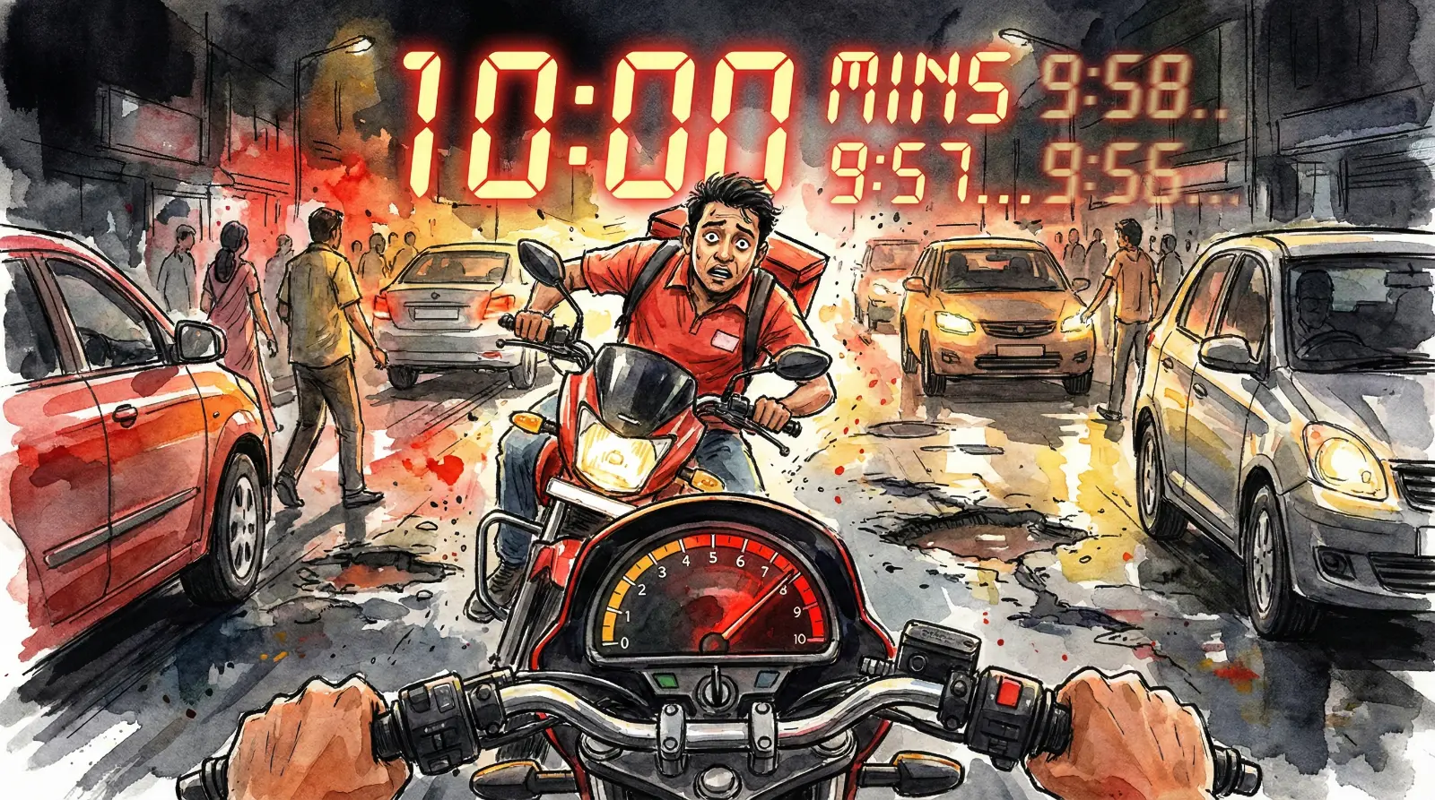 Imagine you are waiting at a traffic signal in Bengaluru. It is pouring rain. You are sitting comfortably inside your car with the windows rolled up. But right next to you, a young man on a bike, wearing a red or orange t-shirt, is anxiously checking his phone. The rain is soaking him, but his worry is not the weather. His worry is the timer ticking down on his mobile screen. He does not fear the traffic police or the red light as much as he fears the little digital boss in his pocket—the Algorithm. Before the steaming hot biryani we ordered reaches our doorstep, the journey it traverses is not just through traffic-clogged roads, but through a complex digital labyrinth.