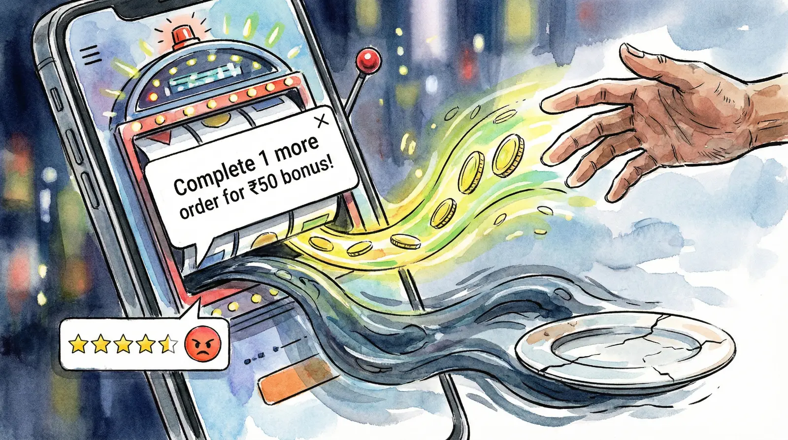 Another major psychological game played here is 'Gamification'. Just like earning points for crossing a level in a video game, here they are offered "Incentives". The app flashes a notification: "Complete 3 more orders to earn ₹200 extra." The boy, blinded by the lure of that ₹200, ignores his exhaustion and hunger, kicks starts his bike, and races towards the next order. This works exactly like the mindset of a gambler in a casino. In the rush to hit the target, basic needs like food, sleep, and health are forgotten. This 'incentive' is the carrot on the stick that keeps them running like a hamster on a wheel.