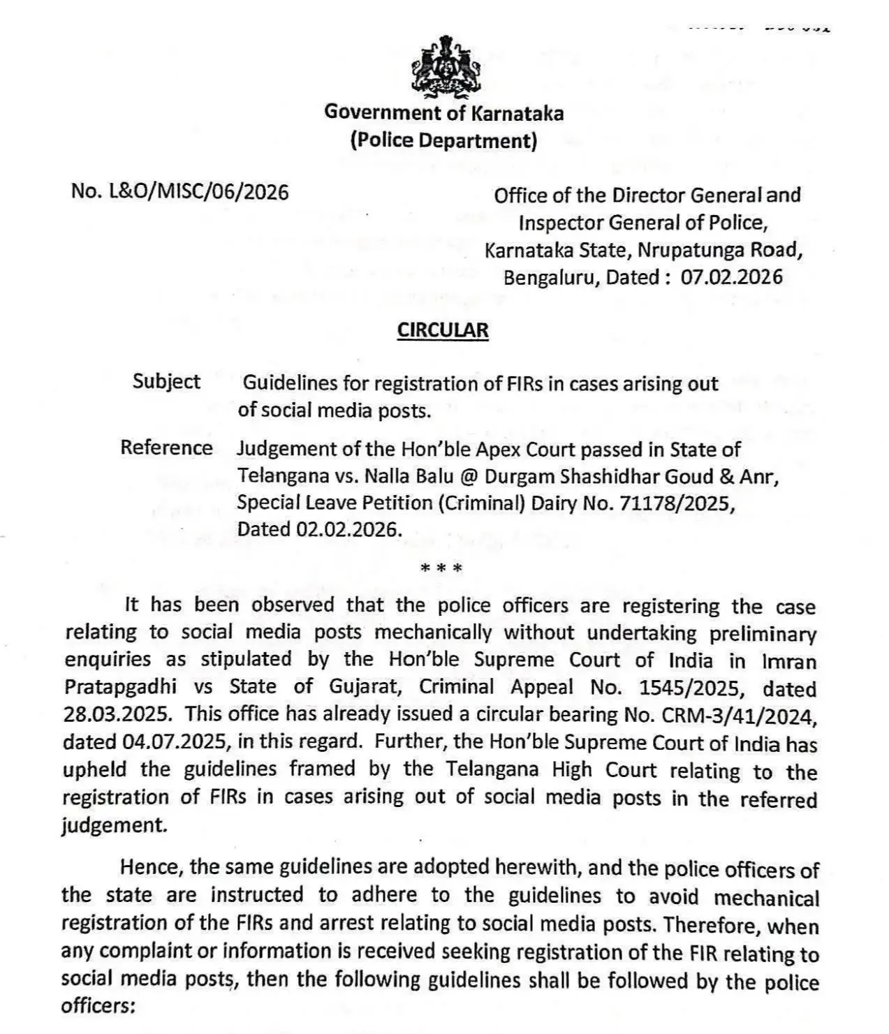 Digital Freedom Gets a Shield with New Karnataka Police Guidelines End of Mechanical FIRs for Social Media Posts in Karnataka Strict Thresholds and Legal Scrutiny Now Mandatory for Digital Cases Protecting Political Speech as a Constitutional Right in the Digital Era Police Reform in 2026 Focuses on Due Process for Online Content