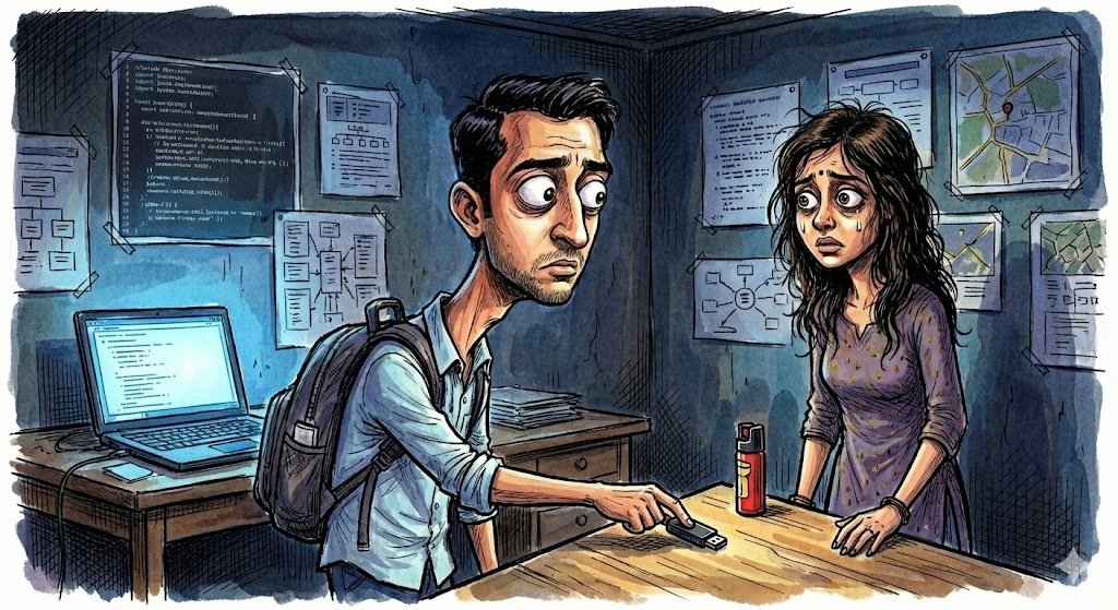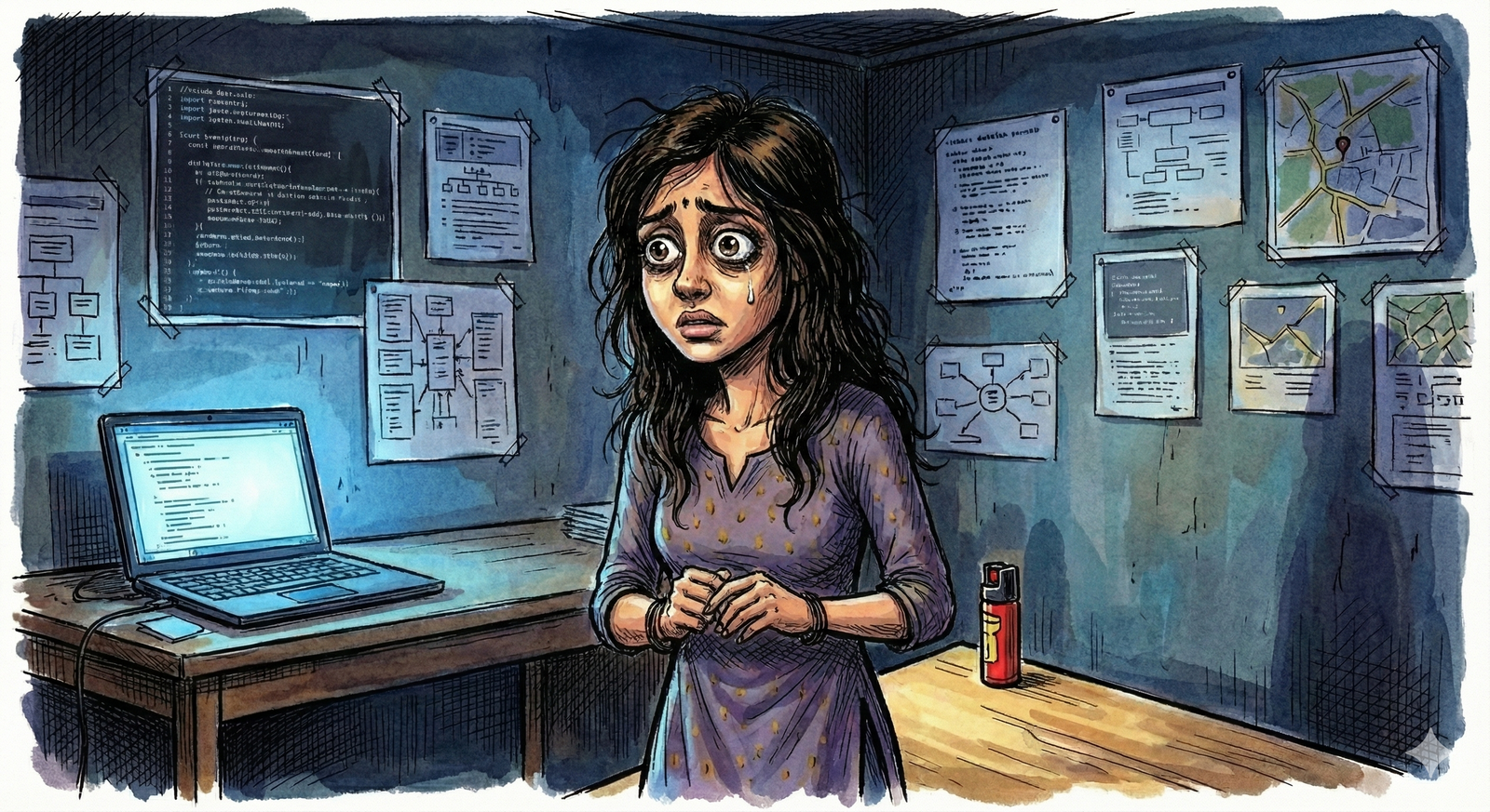 ಒಂದು ನಿಮಿಷದ ಮೌನದ ನಂತರ, ಬಾಗಿಲಿನ ಚಿಲಕಗಳು ತೆರೆದುಕೊಳ್ಳುವ ಸದ್ದು ಕೇಳಿಸಿತು. ಒಂದಲ್ಲ, ಎರಡಲ್ಲ, ಮೂರು ಲಾಕ್ ಗಳನ್ನು ತೆಗೆಯಲಾಯಿತು. ಬಾಗಿಲು ಸ್ವಲ್ಪವೇ ತೆರೆದುಕೊಂಡಿತು. ಕತ್ತಲೆಯಲ್ಲಿ ಒಂದು ಮುಖ ಕಂಡಿತು. ಭಯದಿಂದ ಕಂಗೆಟ್ಟ ಕಣ್ಣುಗಳು. ಕೈಯಲ್ಲಿ ಒಂದು ಪೆಪ್ಪರ್ ಸ್ಪ್ರೇ ಬಾಟಲಿ.