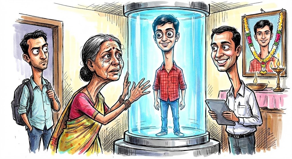 ಅನಂತ್ ನ ತಾಯಿ ಸಾವಿತ್ರಮ್ಮ ಸೋಫಾದ ಮೇಲೆ ಕುಳಿತಿದ್ದರು. ಅವರ ಮುಖದಲ್ಲಿ ಹನ್ನೊಂದು ದಿನಗಳ ಶೋಕದ ಕಲೆಗಳಿದ್ದವು, ಕಣ್ಣುಗಳು ಅತ್ತು ಅತ್ತು ಊದಿಕೊಂಡಿದ್ದವು. ಆದರೆ ಇಂದು ಅವರ ಕಣ್ಣಲ್ಲಿ ಒಂದು ವಿಚಿತ್ರವಾದ ಹೊಳಪಿತ್ತು. ಅದು ಭರವಸೆಯೋ ಅಥವಾ ಭ್ರಮೆಯೋ ತಿಳಿಯದಂತ ಪ್ರಖರತೆ ಅದರಲ್ಲಿತ್ತು. ಸಿದ್ದಾರ್ಥನನ್ನು ಕಂಡ ಕೂಡಲೇ ಅವರು ಎದ್ದು ಬಂದರು. "ಬಾ ಸಿದ್ದು... ಬಂದ್ರಾ ಅವರು? ಇನ್ನೇನು ಸ್ವಲ್ಪ ಹೊತ್ತಿನಲ್ಲಿ ಅನಂತ್ ಬರ್ತಾನೆ," ಎಂದು ಅವರು ಹೇಳಿದಾಗ ಸಿದ್ದಾರ್ಥನ ಗಂಟಲು ಬಿಗಿದಂತಾಯಿತು. ಮಗ ಸತ್ತಿದ್ದಾನೆ ಎಂಬ ಕಟು ಸತ್ಯವನ್ನು ಒಪ್ಪಿಕೊಳ್ಳಲು ನಿರಾಕರಿಸುವ ತಾಯಿಯ ಮನಸ್ಸು, ಈಗ ಈ ತಂತ್ರಜ್ಞಾನದ ಮಾಯಾಜಾಲಕ್ಕೆ ಜೋತು ಬಿದ್ದಿತ್ತು.