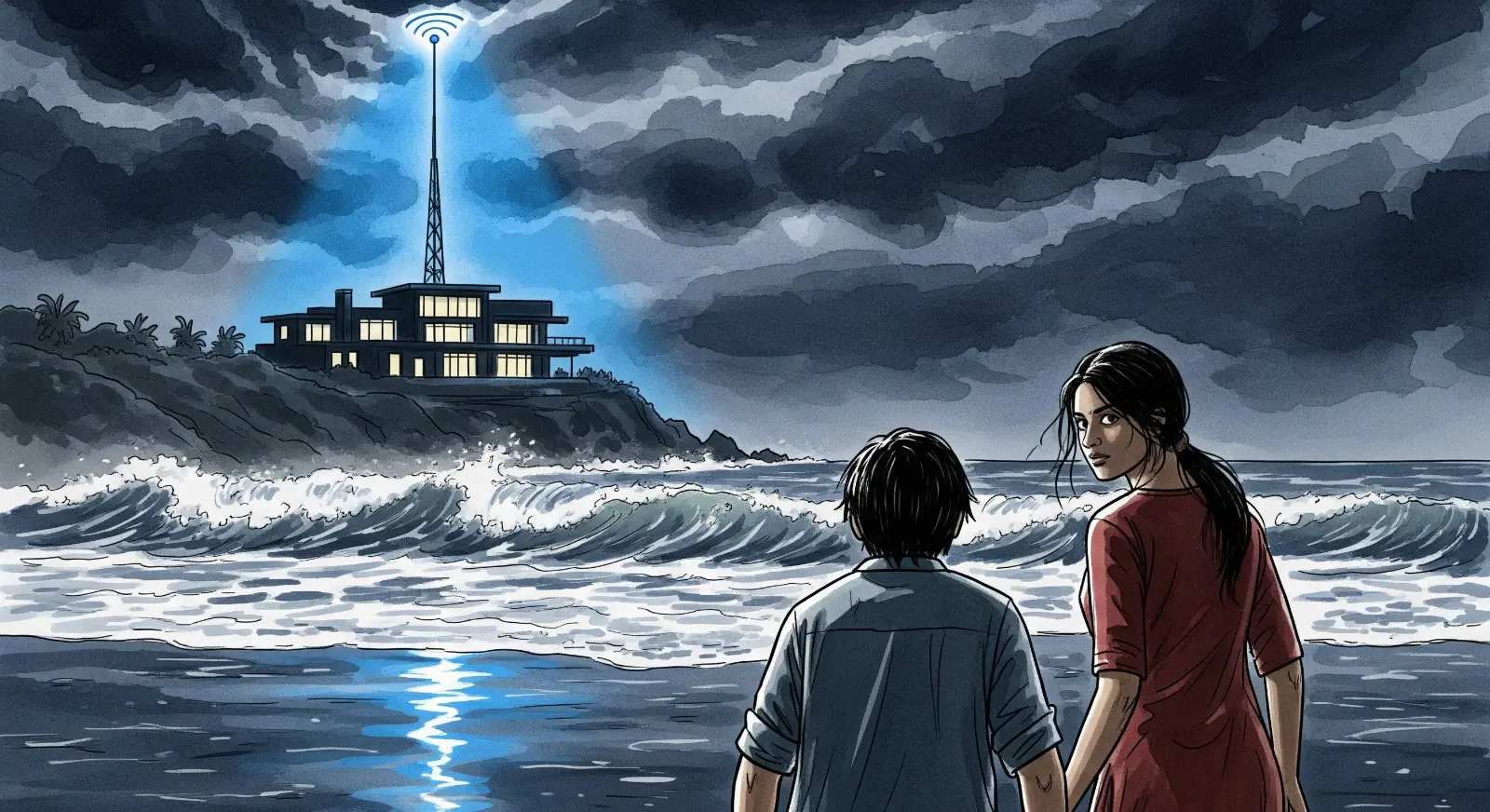 ಹೊರಗೆ ಮಳೆ ಇನ್ನೂ ಸುರಿಯುತ್ತಿತ್ತು. ಅವರು ಕಾಂಪೌಂಡ್ ಹಾರಿ, ಕಡಲ ತೀರದ ಮರಳಿನಲ್ಲಿ ಓಡಿದರು. ಹಿಂದಿರುಗಿ ನೋಡಿದಾಗ, ಆ ಬಂಗಲೆಯ ಎಲ್ಲಾ ದೀಪಗಳು ಒಮ್ಮೆಲೆ ಆರಿಹೋದವು. ಆದರೆ ಬಂಗಲೆಯ ಮೇಲ್ಭಾಗದಲ್ಲಿದ್ದ ದೊಡ್ಡ ಆಂಟೆನಾ ಮಾತ್ರ ನೀಲಿ ಬಣ್ಣದಲ್ಲಿ ಉರಿಯುತ್ತಿತ್ತು. ಆ ಆಂಟೆನಾದಿಂದ ಒಂದು ಬಲವಾದ ಸಿಗ್ನಲ್ ಆಕಾಶಕ್ಕೆ ಚಿಮ್ಮಿತು.