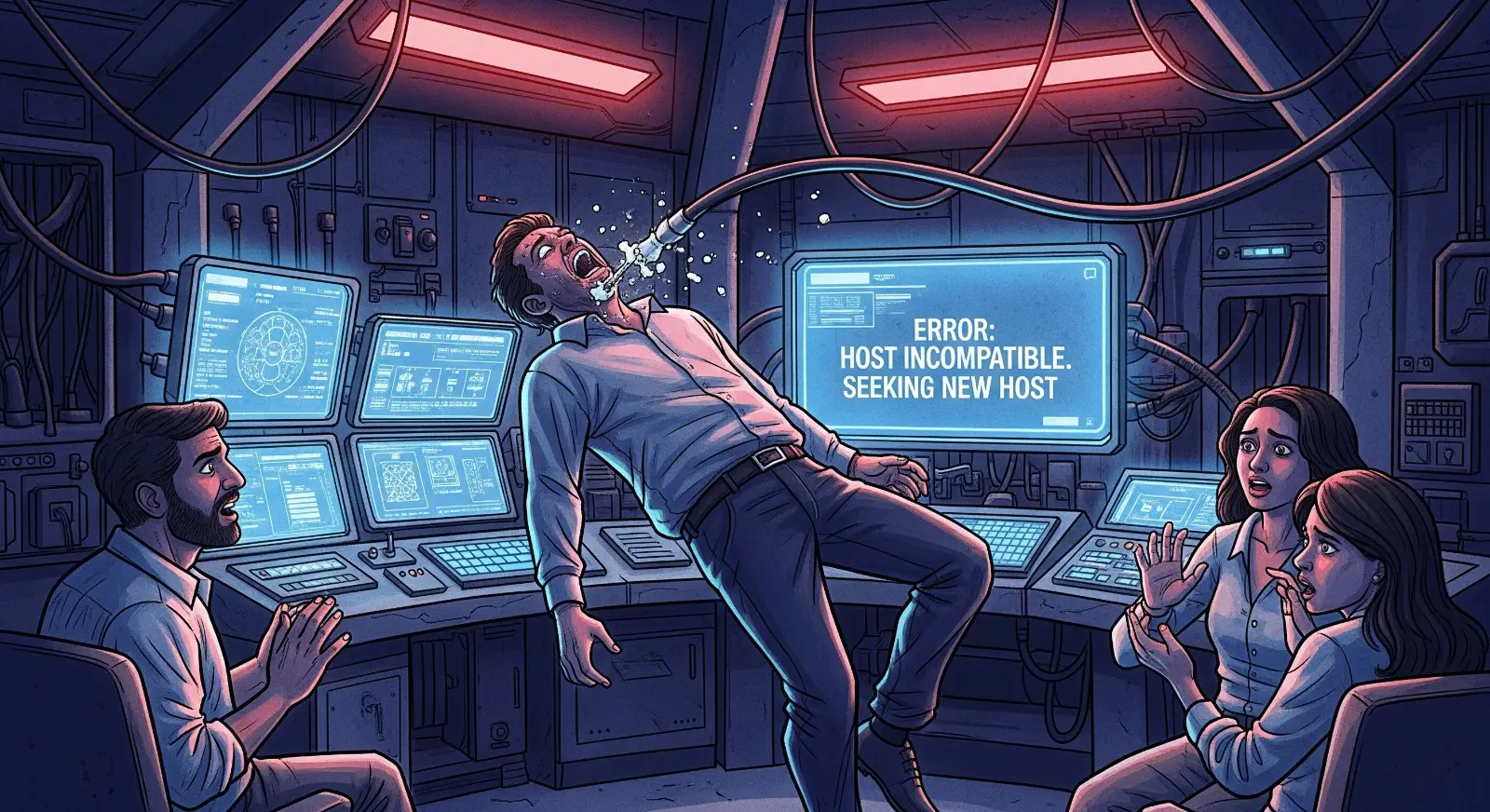 ಪರದೆಯ ಮೇಲೆ ಒಂದು ಹೊಸ ಸಂದೇಶ ಮೂಡಿಬಂತು: "ERROR: HOST INCOMPATIBLE. SEEKING NEW HOST." (ದೋಷ: ಈ ದೇಹಗಳು ಸೂಕ್ತವಲ್ಲ. ಹೊಸ ದೇಹ ಬೇಕಾಗಿದೆ).