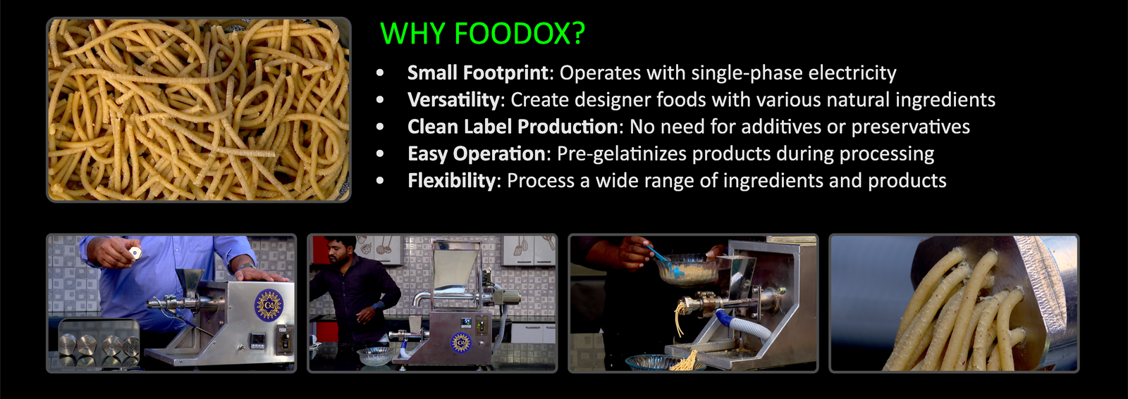ಡಾ. ಚೇತನ್ ಸಿ. ಜೆ: ನಮ್ಮ ಪ್ರಮುಖ ಆವಿಷ್ಕಾರಗಳಲ್ಲಿ ಒಂದು 'FoodoX'. ಇದನ್ನು ಕೇವಲ ಒಂದು ಯಂತ್ರ ಎನ್ನುವುದಕ್ಕಿಂತ ಸಂಸ್ಕರಣಾ ತಂತ್ರಜ್ಞಾನ ಎಂದು ಕರೆಯುವುದು ಸೂಕ್ತ. ಇದು ಯಾವುದೇ ಅಡೆತಡೆಯಿಲ್ಲದೆ ನಿಯಂತ್ರಿತ ವಲಯಗಳ ಮೂಲಕ ವಸ್ತುಗಳನ್ನು ಸಂಸ್ಕರಿಸುವ ನಿರಂತರ ಕಾರ್ಯಾಚರಣೆಗೆ ಅನುವು ಮಾಡಿಕೊಡುತ್ತದೆ. FoodoX ಮಿಕ್ಸಿಂಗ್, ಹೋಮೋಜಿನೈಸೇಶನ್, ಘನ-ದ್ರವ ಬೇರ್ಪಡಿಸುವಿಕೆ, ಫ್ಲೇವರ್ ಎನ್ಕ್ಯಾಪ್ಸುಲೇಷನ್, ಜೆಲಟಿನೈಸೇಶನ್, ಬಾಷ್ಪೀಕರಣ, ತೈಲ ಬೇರ್ಪಡಿಸುವಿಕೆ ಮತ್ತು ಆಹಾರ ಧಾನ್ಯಗಳಲ್ಲಿನ ಪೋಷಕಾಂಶ-ವಿರೋಧಿ ಅಂಶಗಳನ್ನು ಕಡಿಮೆ ಮಾಡುವಂತಹ ಅನೇಕ ಕಾರ್ಯಗಳನ್ನು ನಿರ್ವಹಿಸಬಲ್ಲದು. ಇದು ಫಾರ್ಮಾಸ್ಯುಟಿಕಲ್ ಪ್ರೊಸೆಸಿಂಗ್ ಮತ್ತು ಬಯೋಮಾಸ್ ರಿಸೈಕ್ಲಿಂಗ್ನಲ್ಲಿಯೂ ಬಳಕೆಯಾಗುತ್ತದೆ. ಅನೇಕ ಪ್ರತ್ಯೇಕ ಯಂತ್ರಗಳ ಬದಲಾಗಿ ಒಂದೇ, ಸಮಗ್ರ ಪರಿಹಾರವನ್ನು ನೀಡುವುದು ನಮ್ಮ ಉದ್ದೇಶ.