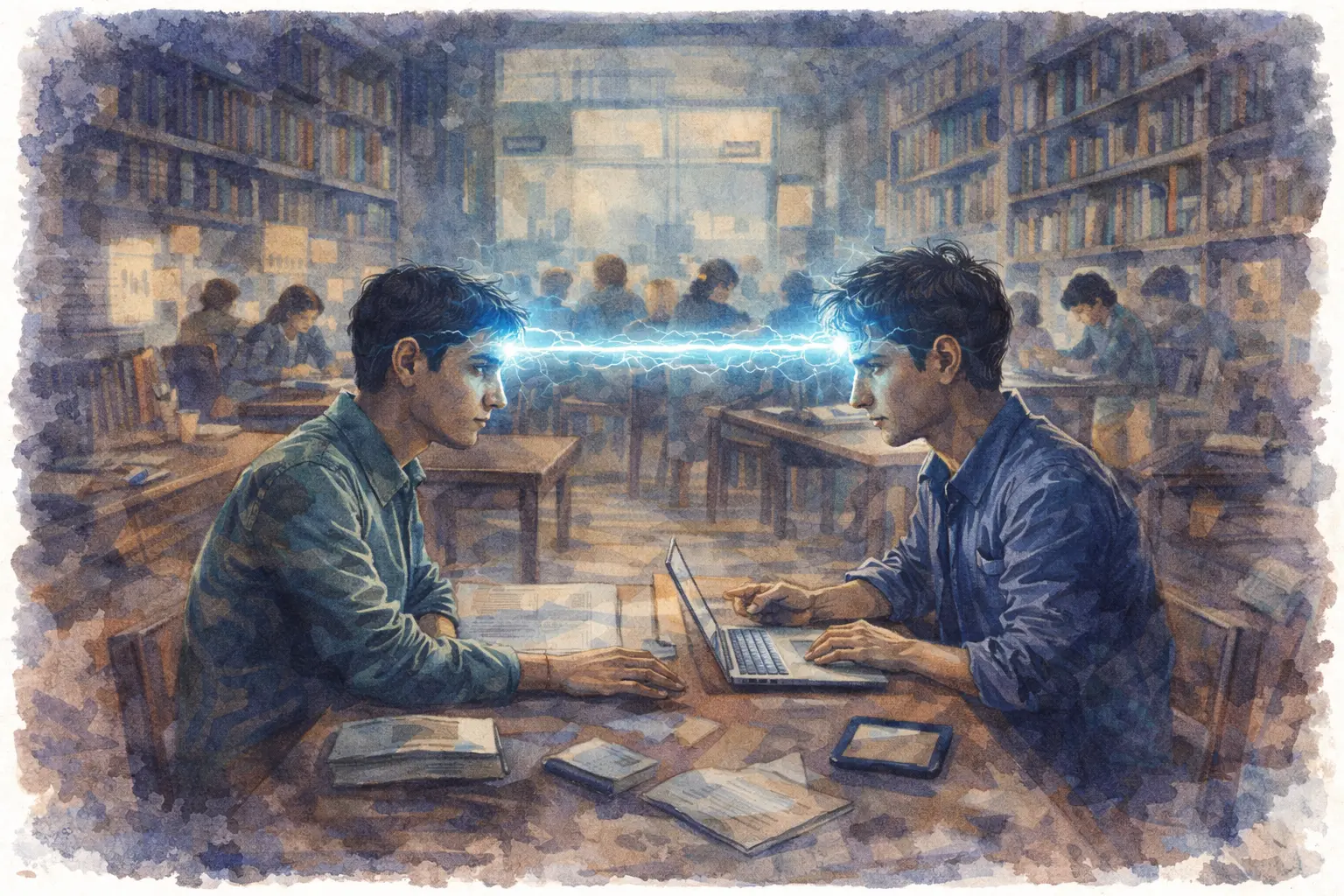 ಅವರು ಬಾಯಿ ಬಿಡಲಿಲ್ಲ. ಆದರೆ ಆರ್ಯನ್ ಮನಸ್ಸಿನಲ್ಲೇ, "ರಾಹುಲ್, ಲೈಬ್ರರಿಯ ಮೂರನೇ ಸಾಲಿನಲ್ಲಿರುವ ಪುಸ್ತಕ ತಗೋ" ಎಂಬ ಆಲೋಚನೆ ಬಂತು. ರಾಹುಲ್ ತಕ್ಷಣ ಎದ್ದು ಹೋಗಿ ಅದೇ ಪುಸ್ತಕವನ್ನು ತೆಗೆದ.